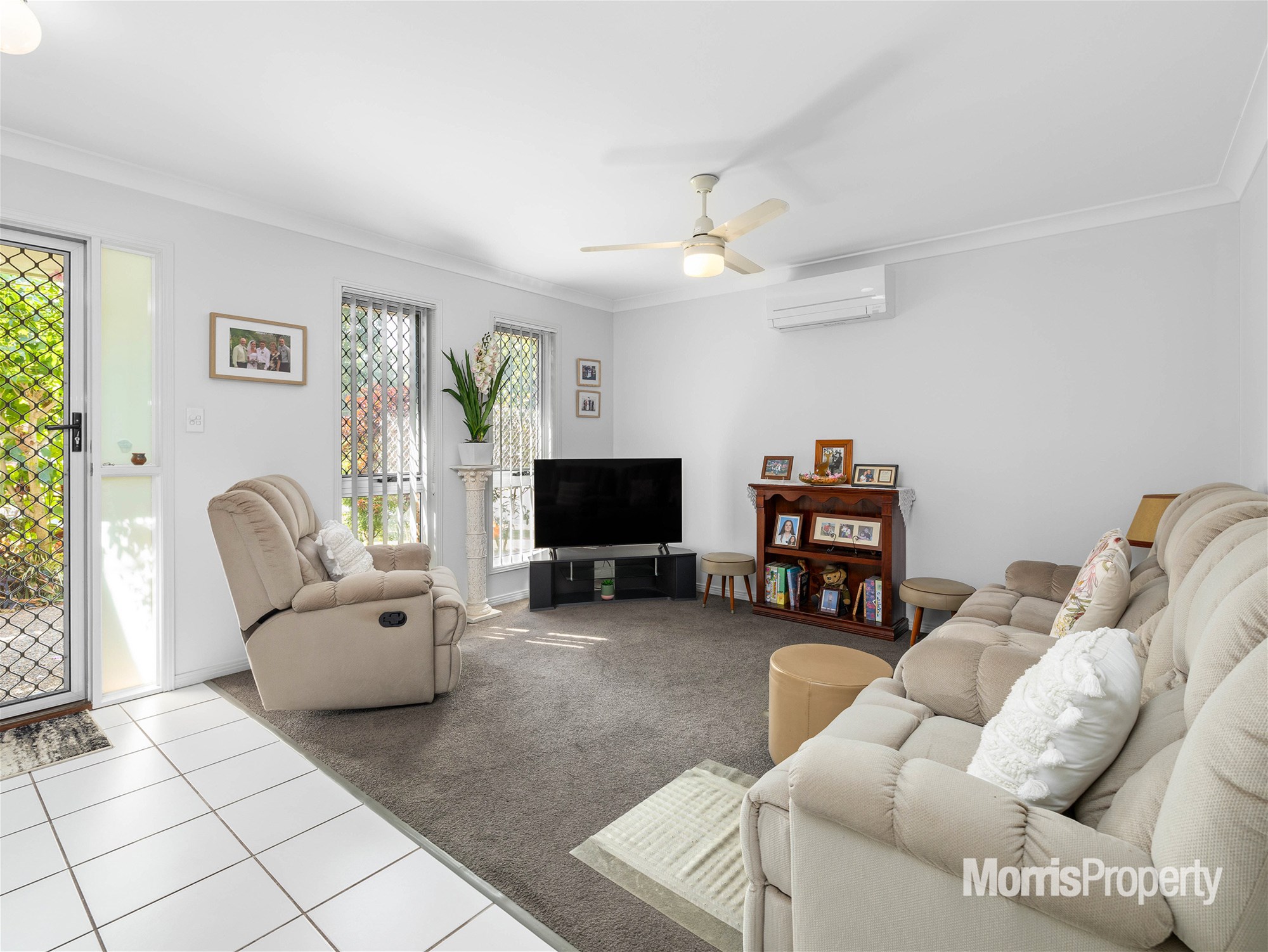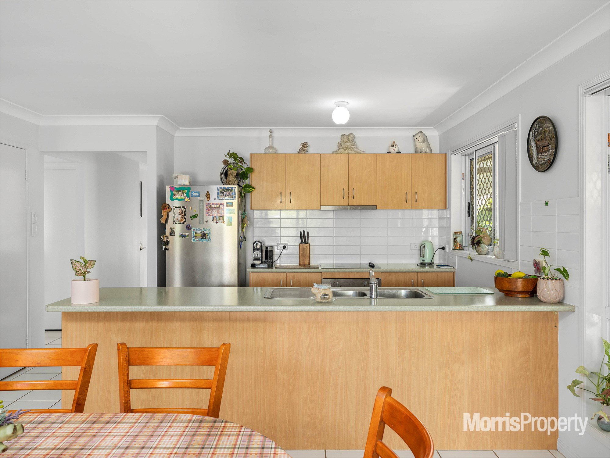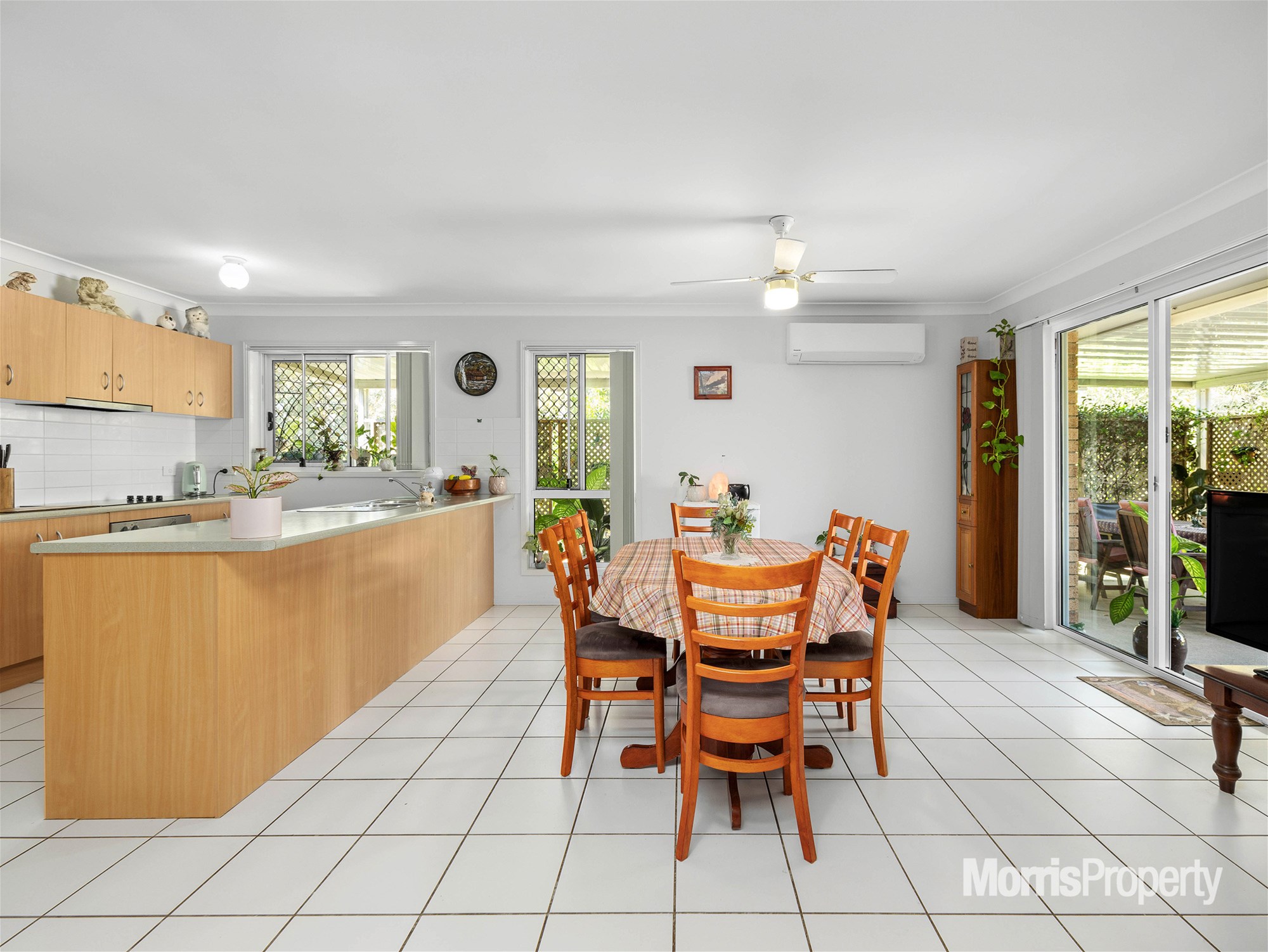 The home features an air-conditioned formal lounge room to the front and a kitchen with a dining room/second living area to the back. The kitchen offers ample storage, stainless steel appliances, and a window server.